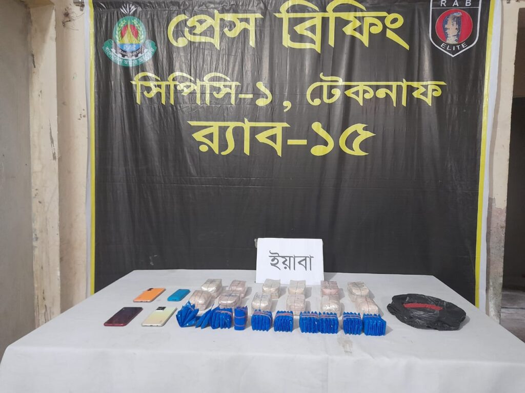 তিনি জানান, বৃহস্পতিবার (৩০ মে) রাতে গোপন সংবাদের ভিত্তিতে টেকনাফ থানাধীন টেকনাফ সদর ইউনিয়নের ১নং ওয়ার্ডস্থ হাবির ছড়া এলাকার জনৈক আব্দুল মতলবের পাকা বসতঘরের ভিতর ক্রয়-বিক্রয়ের উদ্দেশ্যে মাদকদ্রব্যসহ কতিপয় মাদক কারবারী অবস্থান করছে। এমন সংবাদের ভিত্তিতে র্যাব-১৫, সিপিসি-১ টেকনাফ ক্যাম্পের আভিযানিক দল উক্ত এলাকায় মাদক বিরোধী অভিযান পরিচালনা করে। এ সময় র্যাবের উপস্থিতি বুঝতে পেরে ঘর থেকে বেরিয়ে পালানোর চেষ্টাকালে পার্শ্ববর্তী দেশের এক রোহিঙ্গা নাগরিকসহ তিনজন মাদক কারবারীকে আটক করতে সক্ষম হয় আভিযানিক দল। প্রাথমিক জিজ্ঞাসাবাদে প্রাপ্ত তথ্যানুযায়ী উপস্থিত সাক্ষীদের সম্মুখে বিবি মোতাবেক আটককৃতদের দেহ ও উক্ত বসত ঘর তল্লাশী করে শয়ন কক্ষের খাটের নিচে থাকা একটি সাদা রংয়ের শপিং ব্যাগের ভিতর থেকে ৩৩ হাজার ৪০০ পিস ইয়াবা, ভেঙ্গে যাওয়া ইয়াবা ৩৫০ গ্রাম এবং ৩টি স্মার্ট ও ১টি বাটন ফোন উদ্ধার করা হয়।