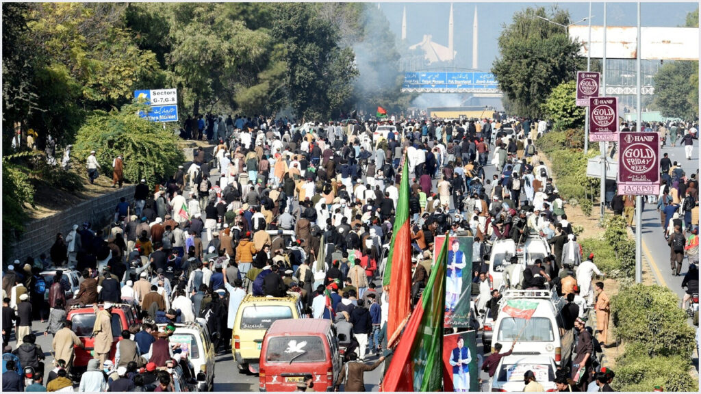 ইমরান খানের স্ত্রী বুশরা বিবির নেতৃত্বে কর্মী-সমর্থকের বিশাল একটি বহর এখনও ইসলামাবাদ থেকে কয়েক কিলোমিটার দূরে রয়েছে। কর্তৃপক্ষের কঠোর প্রতিক্রিয়ার কারণে এই বহরের ইসলামাবাদ অভিমুখী গতি কমিয়ে দেওয়া হয়েছে।