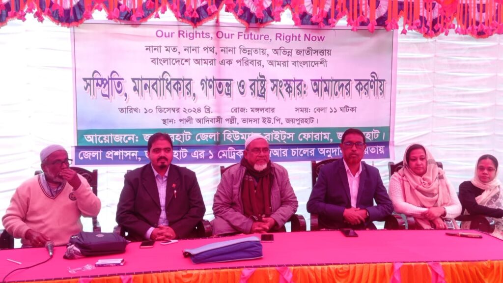 জেলা হিউম্যান রাইটস ফোরামের যুগ্ম সম্পাদক অধ্যাপক আমিনুর রহমানের সভাপতিত্বে বক্তব্য রাখেন জয়পুরহাট পৌর বিএনপির সাধারণ সম্পাদক আবু রায়হান উজ্জ্বল প্রধান, জেলা মহিলা দলের সহসভাপতি মৌসুমী প্রধান, ফোরামের সদস্য সচিব শাহাবুদ্দিন, সদস্য ইঞ্জিনিয়ার আব্দুল বাতেল, ভাদসা ইউপির প্যানেল চেয়ারম্যান শাহ আলম, আদিবাসী নেতা রতন সহ অন্যরা।