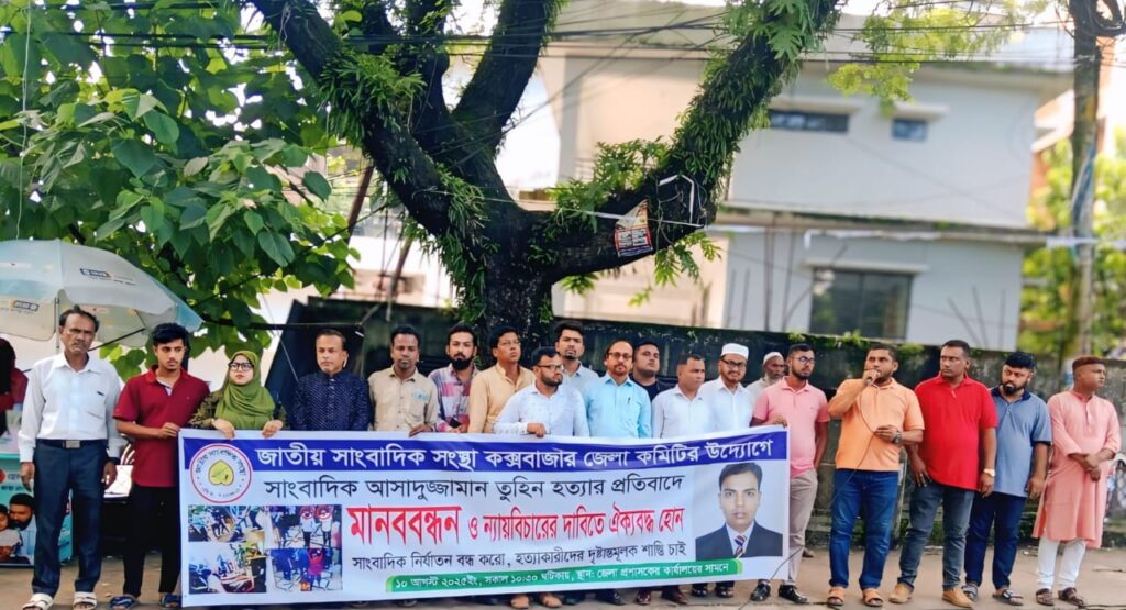 রবিবার (১০ আগস্ট) সকাল ১১ ঘটিকার সময় কক্সবাজার জেলা প্রশাসকের কার্যালয়ের সামনে জাতীয় সাংবাদিক সংস্থা কক্সবাজার জেলা কমিটির সদস্য সিরাজুল ইসলাম আজাদের পরিচালনায় জাতীয় সাংবাদিক সংস্থা কেন্দ্রীয় কমিটির সহ-পাঠাগার সচিব ও সাবেক সাধারণ সম্পাদক ওসমান গনি ইলির সভাপতিত্বে এই মানববন্ধন ও বিক্ষোভ কর্মসূচি অনুষ্ঠিত হয়।