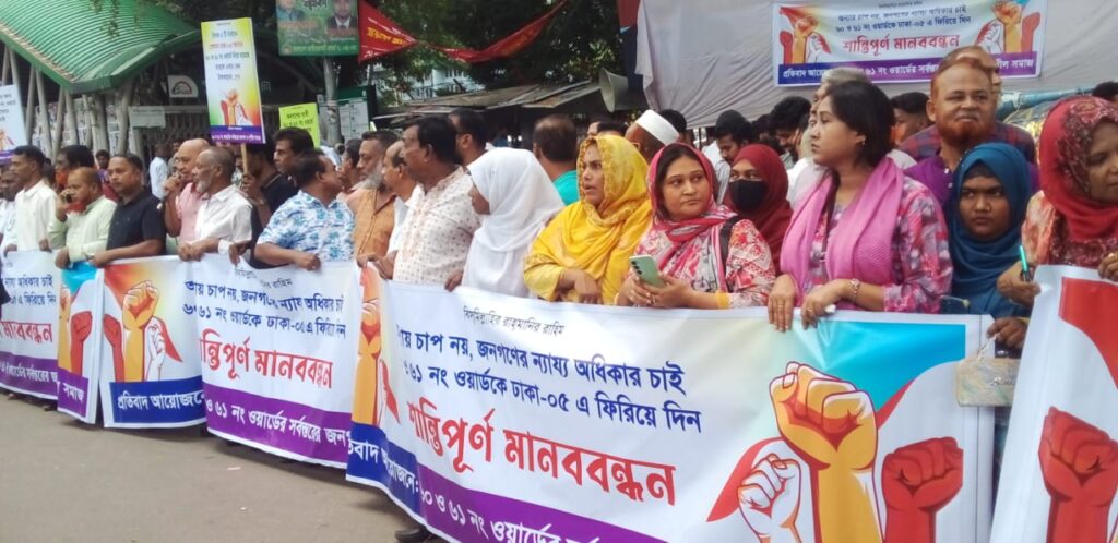 ঢাকা মহানগরের ৬০ ও ৬১ নং ওয়ার্ডের সর্বস্তরের জনগণ, সুশীল সমাজ, ব্যবসায়ী, শিক্ষানুরাগী ও তরুণ সমাজের উদ্যোগে আজ সোমবার সকাল ১০টায় ঢাকা প্রেস ক্লাবের সামনে এক শান্তিপূর্ণ মানববন্ধন অনুষ্ঠিত হয়।