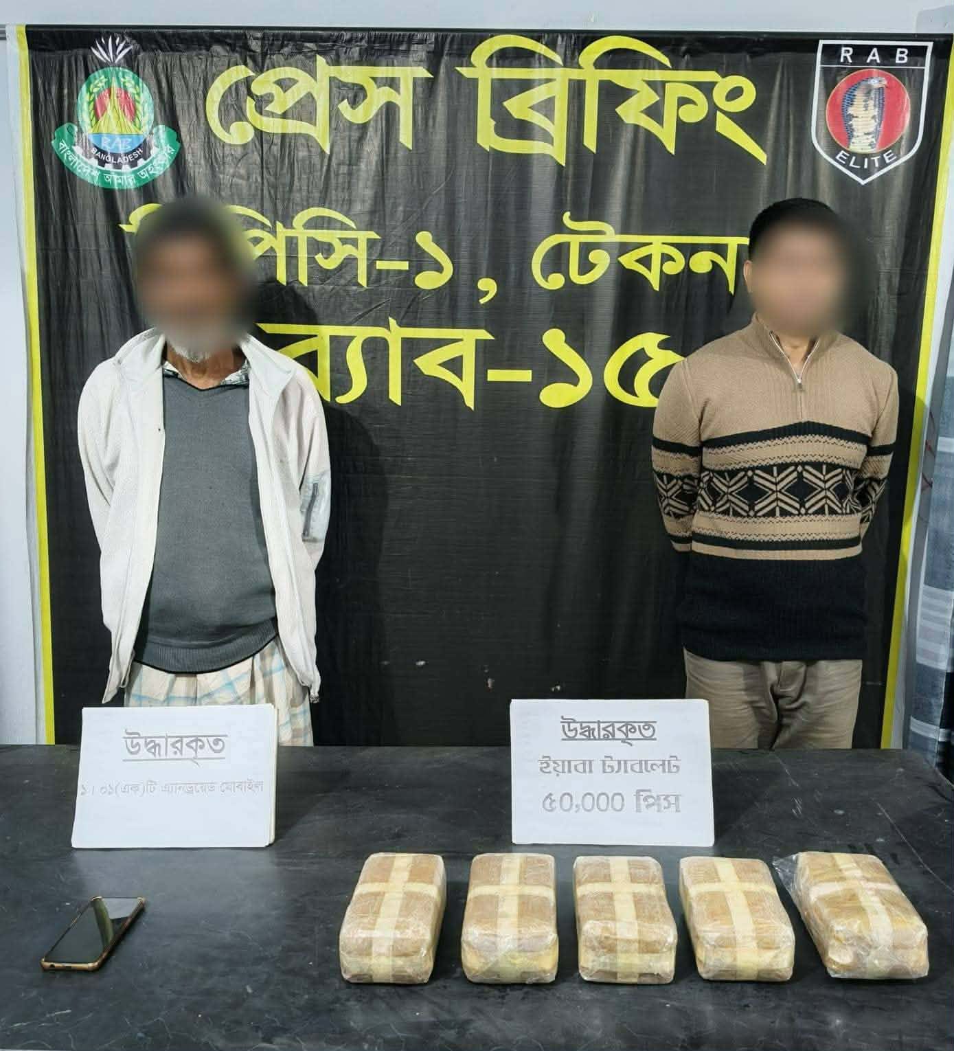র্যাবের চলমান মাদক বিরোধী অভিযানের ধারাবাহিকতায় এবং চলমান গোয়েন্দা তৎপরতার অংশ হিসেবে গোপন সংবাদের ভিত্তিতে গত ২২ ডিসেম্বর ২০২৫ খ্রিঃ তারিখ সিপিসি-১ (টেকনাফ ক্যাম্প), র্যাব-১৫, কক্সবাজার এর একটি চৌকস আভিযানিক দল কক্সবাজার জেলার টেকনাফ মডেল থানাধীন টেকনাফ পৌরসভার ০১ নং ওয়ার্ডের নাইট্যংপাড়াস্থ এলাকায় অভিযান পরিচালনা করে। প্রাপ্ত তথ্যের ভিত্তিতে জনৈক কামাল হেসেন পিতা-মৃত সিরাজ মিয়া এর মালিকানাধীন ০৫ (পাঁচ) তলা বিল্ডিং এর ৩য় তলায় ধৃত আসামী আসাদ উল্লাহ এর ভাড়া বাসায় অভিযান পরিচালনা করে ধৃত আসামীদ্বয়ের দেখানো মতে জনৈক কামাল হেসেন পিতা-মৃত সিরাজ মিয়া এর মালিকানাধীন ০৫ (পাঁচ) তলা বিল্ডিং এর ৩য় তলায় আসামী আসাদ উল্লাহ (৪৬) এর ভাড়াটিয়া বাসার ড্রইং রুম হতে ৫০,০০০ (পঞ্চাশ হাজার) পিস ইয়াবা ট্যাবলেট ও ০১(এক)টি এন্ড্রয়েড মোবাইল ফোন সেটসহ ০২(দুই) জন মাদক কারবারীকে আটক করতে সক্ষম হয়।