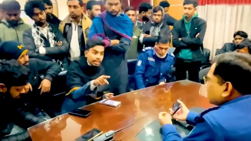 ভিডিওতে দেখা যায়, থানার ভেতরে বসে ওসির সঙ্গে বাগ্বিতণ্ডার এক পর্যায়ে মাহদী হাসান নিজেকে বৈষম্যবিরোধী আন্দোলনের নেতা দাবি করেন এবং বিভিন্ন সহিংস ঘটনার কথা উল্লেখ করে হুমকিমূলক বক্তব্য দিচ্ছেন।