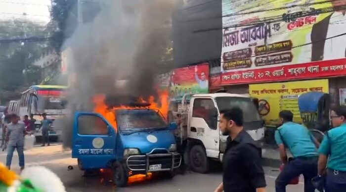 রমনা থানার সামনে পুলিশের গাড়িতে আগুন
